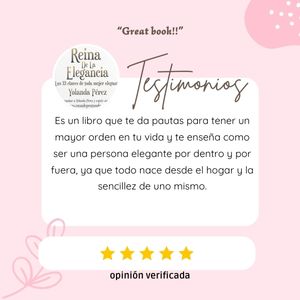 Después de leer el libro, no solo explotarás con gracia y estilo los cuatro puntos más importantes de tu imagen y prestarás atención a tu forma de caminar y sentarte sino que también adoptarás la sencillez como estilo de vida, tu máxima será “saber elegir” y ya nunca más subestimarás el poder de un buen perfume, “la forma más intensa de tu recuerdo”, en palabras de Jean Paul Gaultier. Reina de la Elegancia es más que un libro sobre elegancia, la biblia de todas aquellas mujeres que suspiran por tener ese je ne sais quoi de las mujeres más elegantes y sofisticadas.